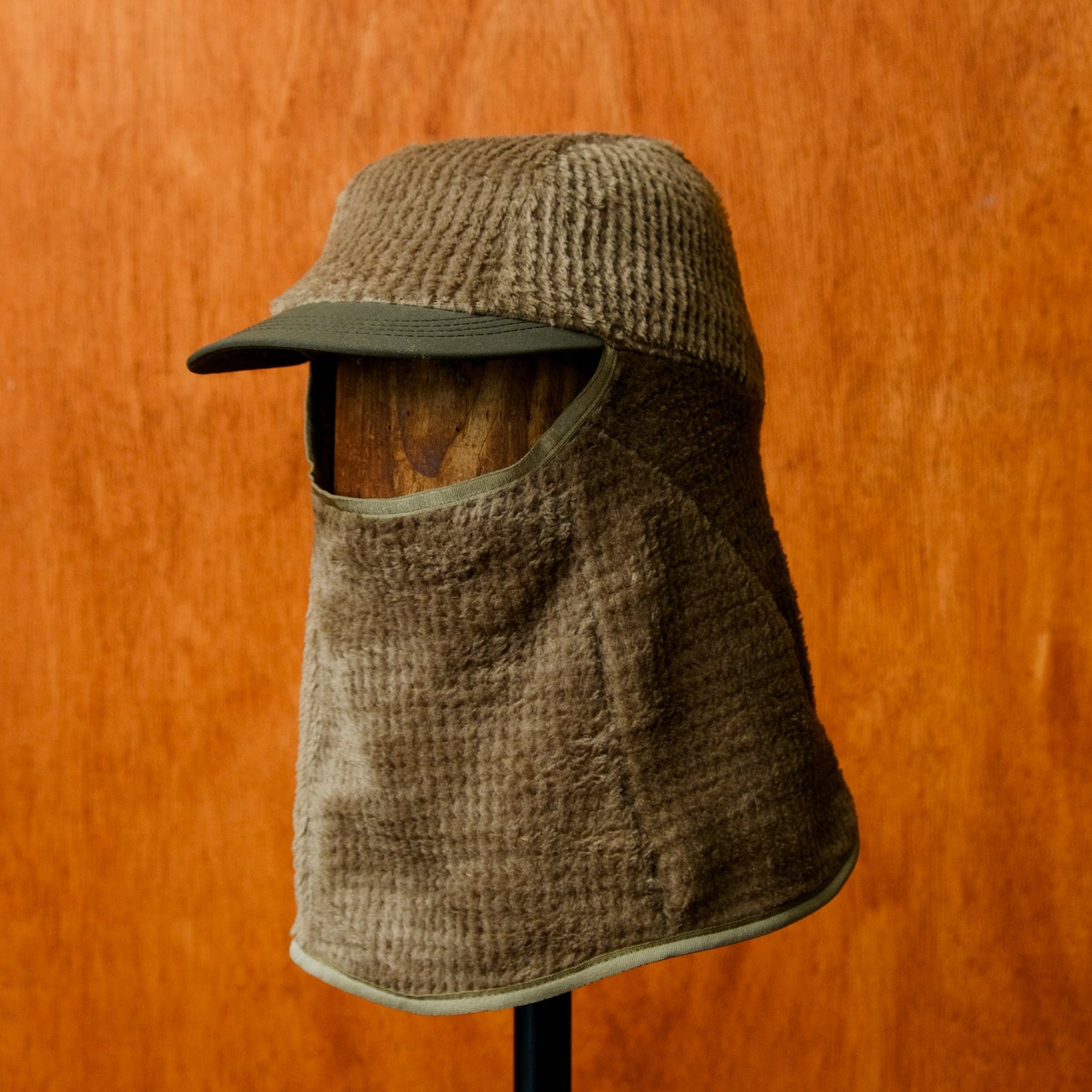Fully extended, the fleece covers most of the face, allowing only enough space for your eyes to see out, but with enough room inside that you don't have any trouble breathing. When not in use, just roll it up like a long beanie, and store it above the brim.