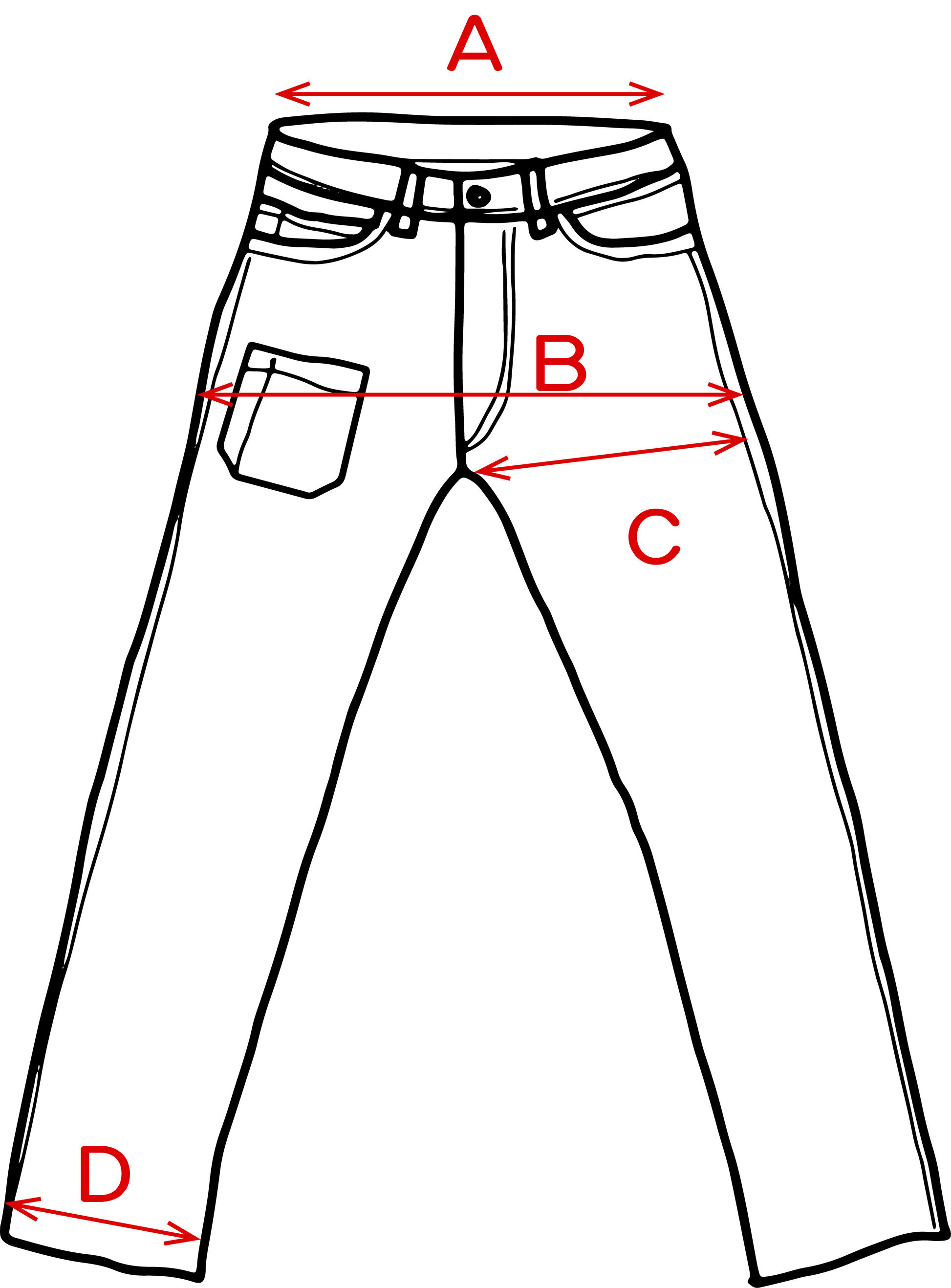 All measurements are taken with the garment laid flat. Waist measurement is actual size, not vanity sizing. Sizes are Waist x Inseam. Rise is measured from the front, and is an a half inch taller in the back. A= waist laid flat, B= widest part of the hips, C= Crotch to thigh edge, D=Cuff. See drawing for approximate location.