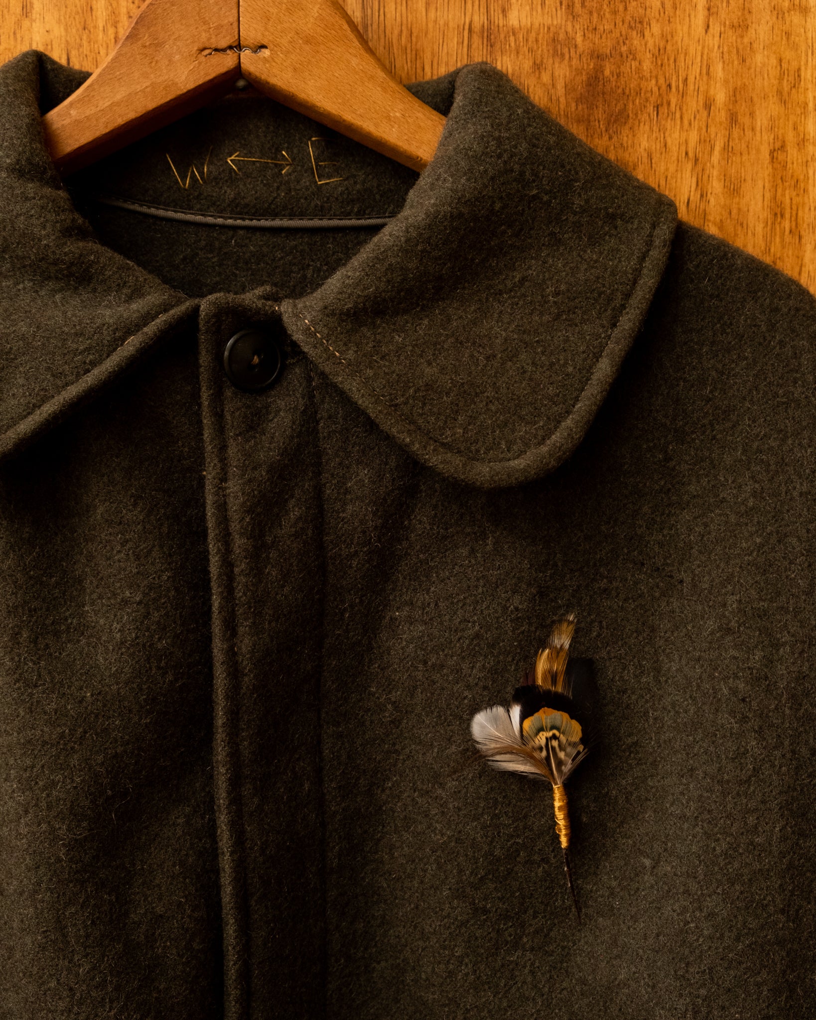 Wool shell, sherpa liner, corduroy patches, feather & bramble boutonnière.