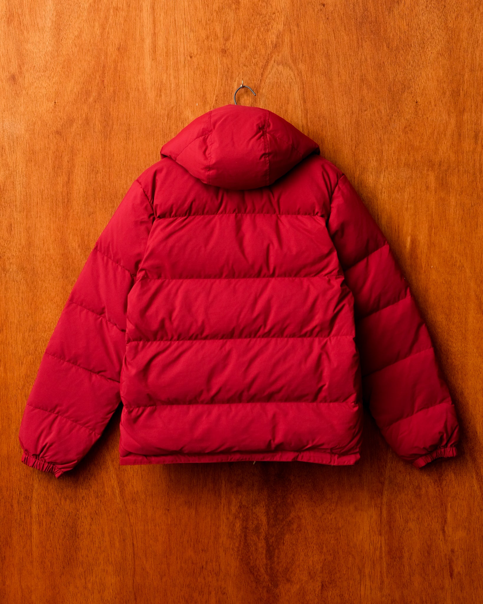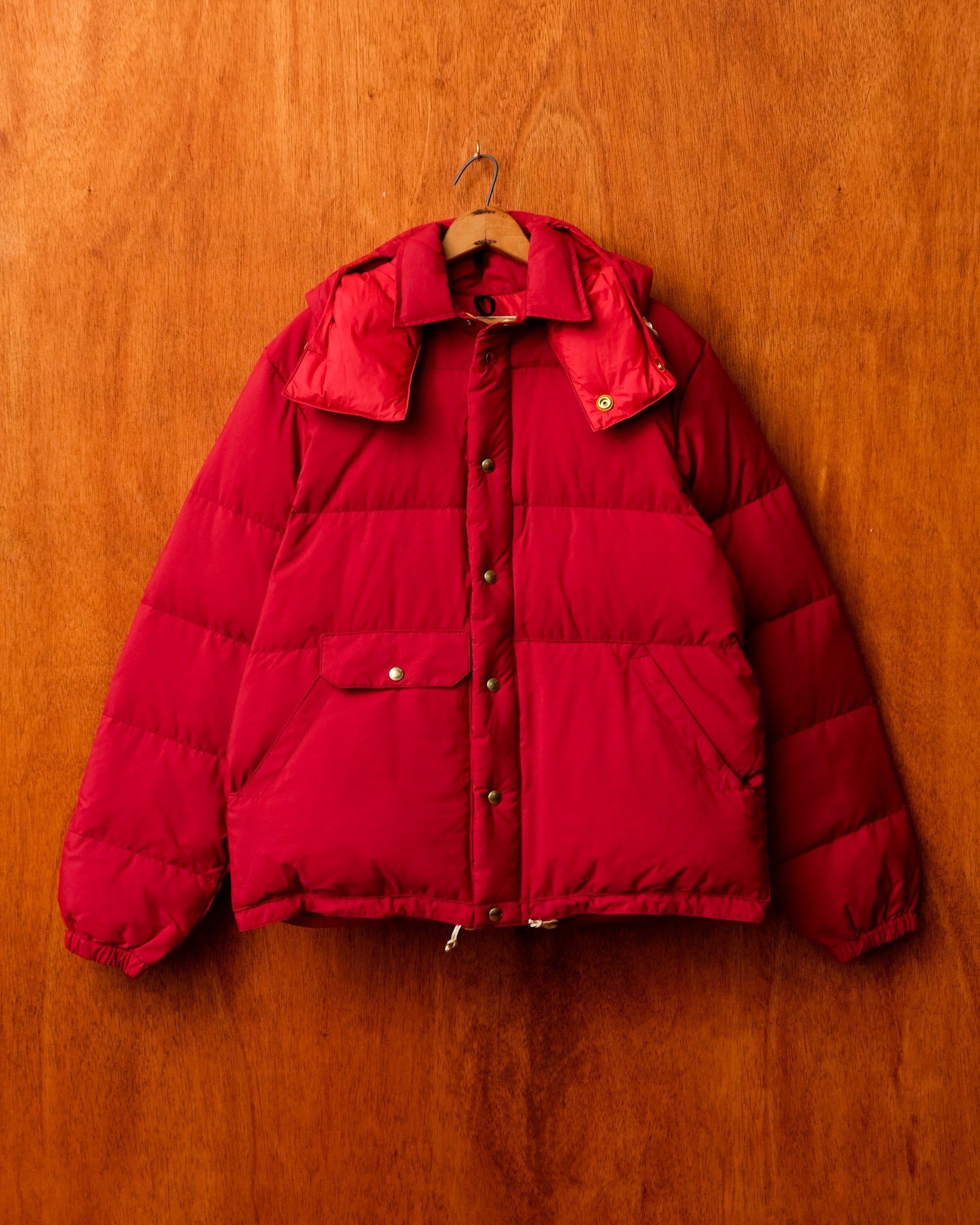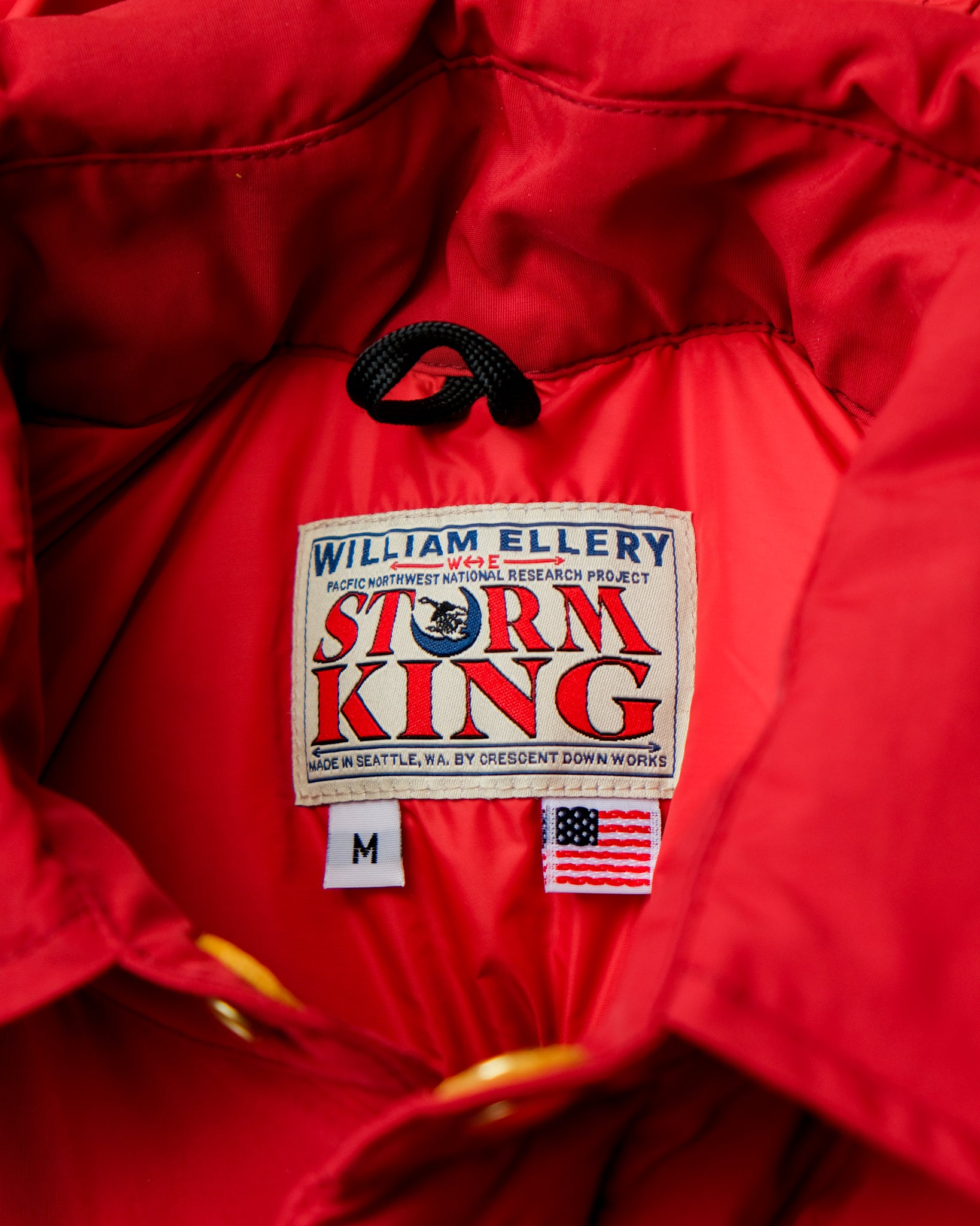 The Storm King is a full winter parka in Crescent Lake blue, and a toasted almond interior, or Expedition Red- Inside and out. The hood is removable, to reveal a western collar full of down.
